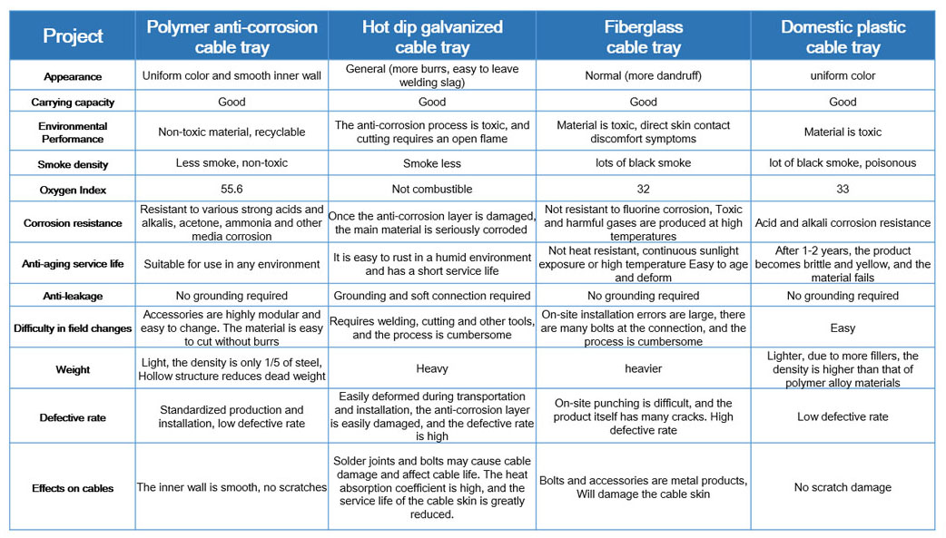 The polymer alloy cable tray is a transformation and upgrade on the basic structure of the traditional metal cable tray, changing the single-layer structure of the metal cable tray, combining with the plastic extrusion process, using PVC, ABS, PS and other polymer resins and a variety of fine chemical additives , After plastic modification, a new type of cable bridge with the traditional metal bridge load capacity and plastic products insulation flame retardant performance, corrosion resistance and long life performance is made of special equipment and mold extrusion. The polymer alloy cable tray overcomes the working condition defects of the metal material of the traditional metal cable tray, and is extremely suitable for cable laying projects in harsh environments such as humidity, corrosive gas, static electricity, liquid, and acid-base adhesion.